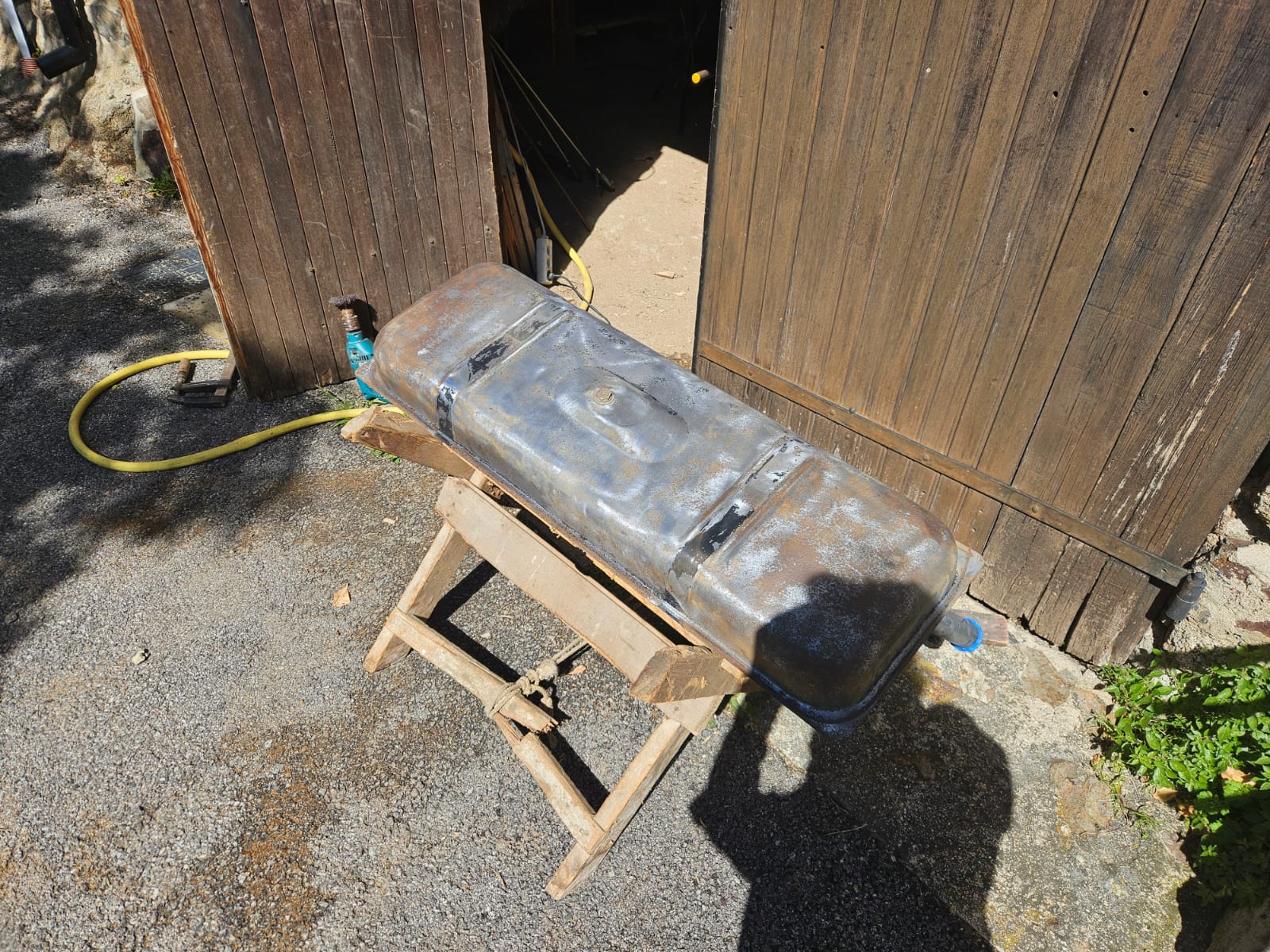On lui donne un gros coup de ponçage à l'extérieur et il retrouve un aspect bien plus prometteur. Après l'avoir rempli d'eau, aucune fuite à l'horizon.