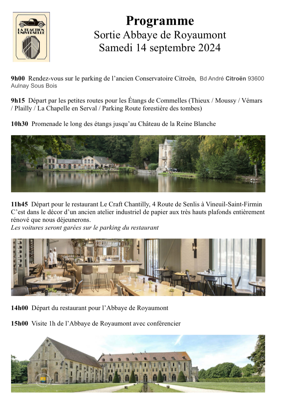 Bonjour à tous, en tant que responsable TU Ile de France section 93, j'organise une sortie samedi 14 septembre. Promenade le long des étangs de Commelles suivie d'un repas au Restaurant le Craft à Chantilly. L'après midi, visite de l'Abbaye de Royaumont avec conférencier (1h). 65€. Vous êtes intéressés ? Contactez moi en MP pour recevoir le bulletin d'inscription.