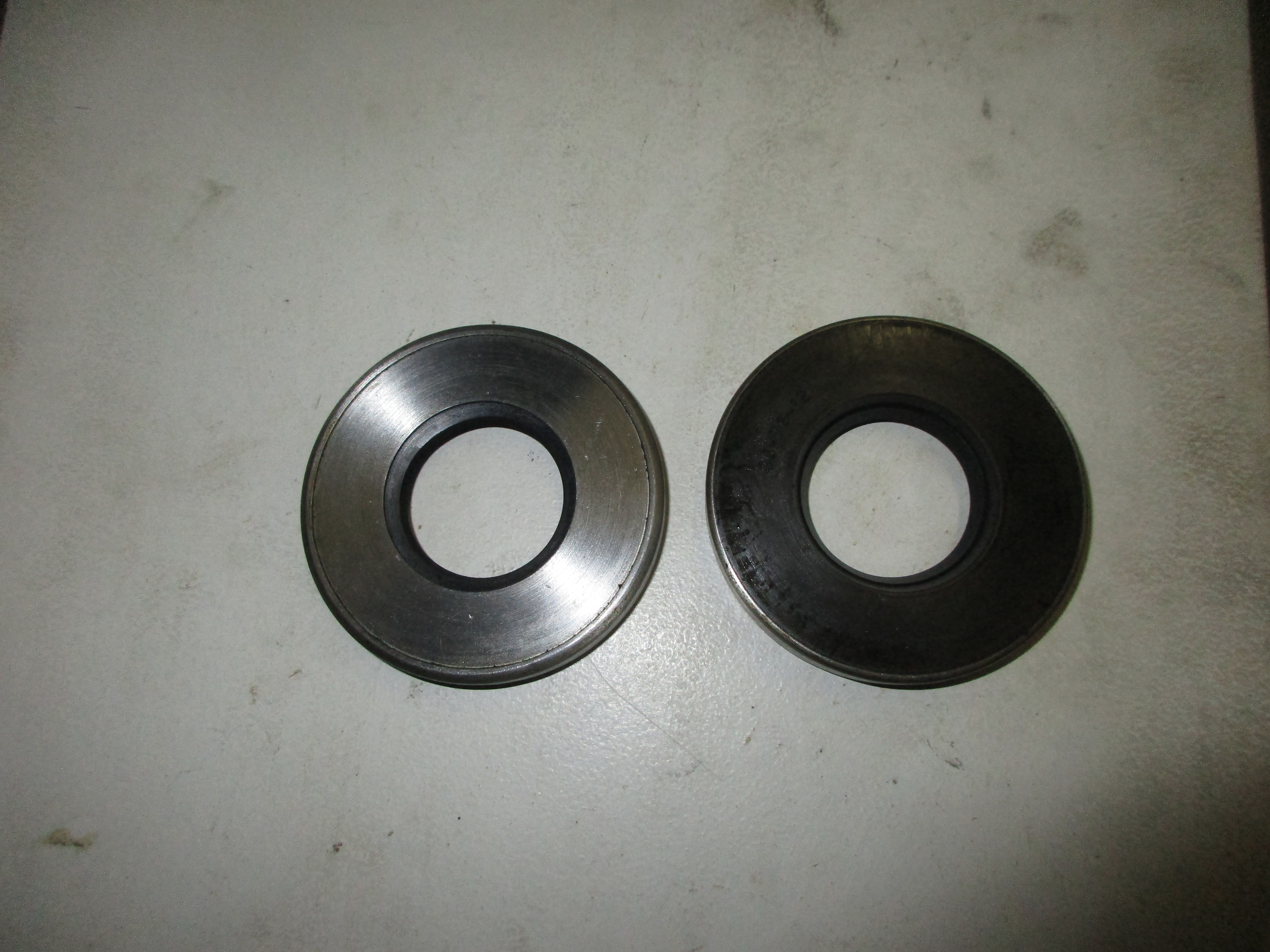 Sur la première photo, la face acier doit être côté intérieur, la face plastique côté extérieur, sur la deuxième photo c'est un comparatif entre un joint d'origine tout acier et lèvre cuir, puis le fameux joint refabriqué qui pose problème et un joint tout plastique, vus de l'intérieur, sur la troisième photo le même comparatif des trois modèles vus côté extérieur.