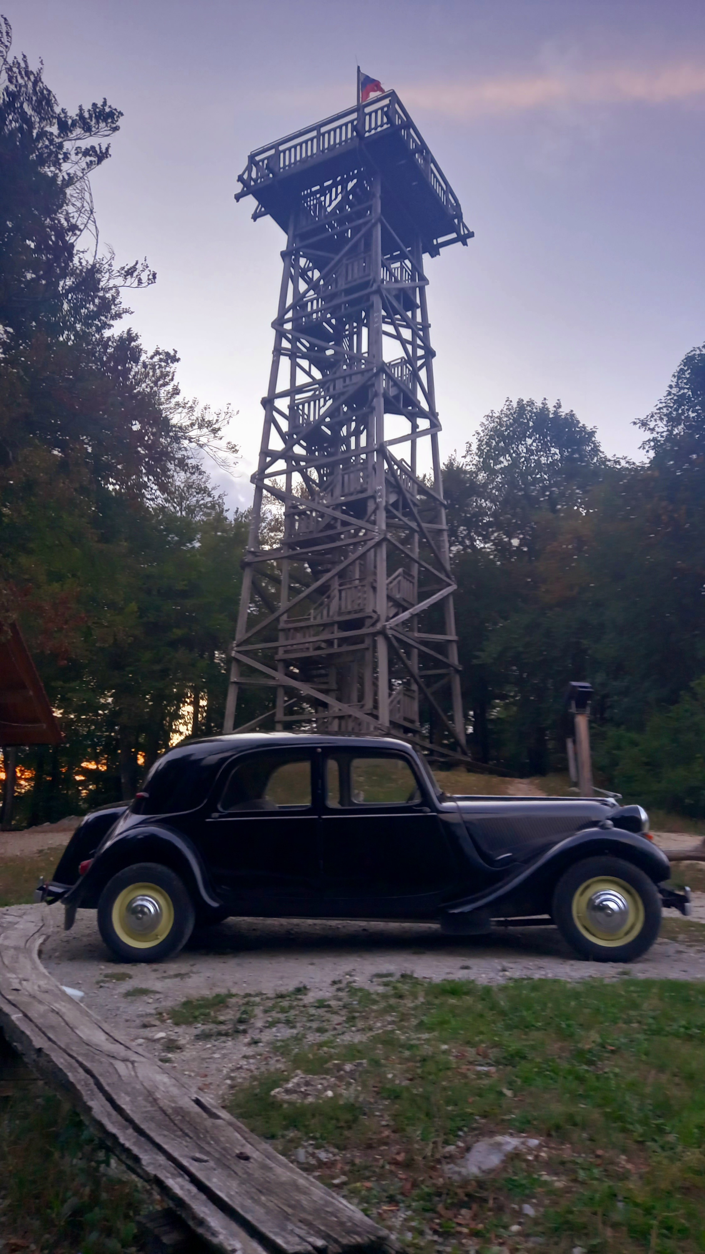 Deux photos du soir du haut d'une colline locale avec une tour de vue.
