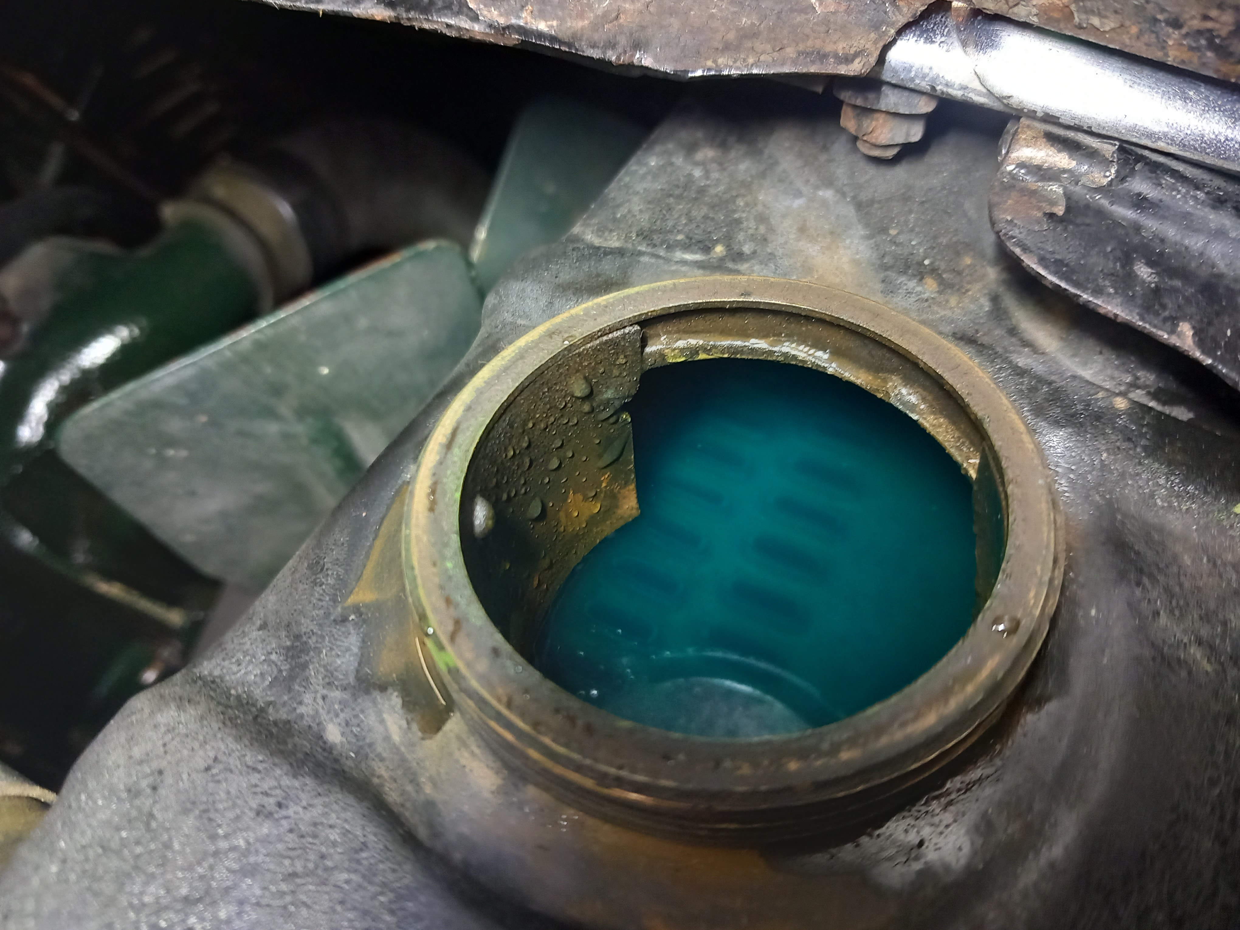 J'ai fini par mettre un nouveau mélange d'antigel et d'eau distillée à l'intérieur. Beaucoup de matière a été consommée, mais je ne l'ai pas regretté, car après un essai routier d'environ 10 km, le liquide de refroidissement était toujours limpide, de couleur émeraude.