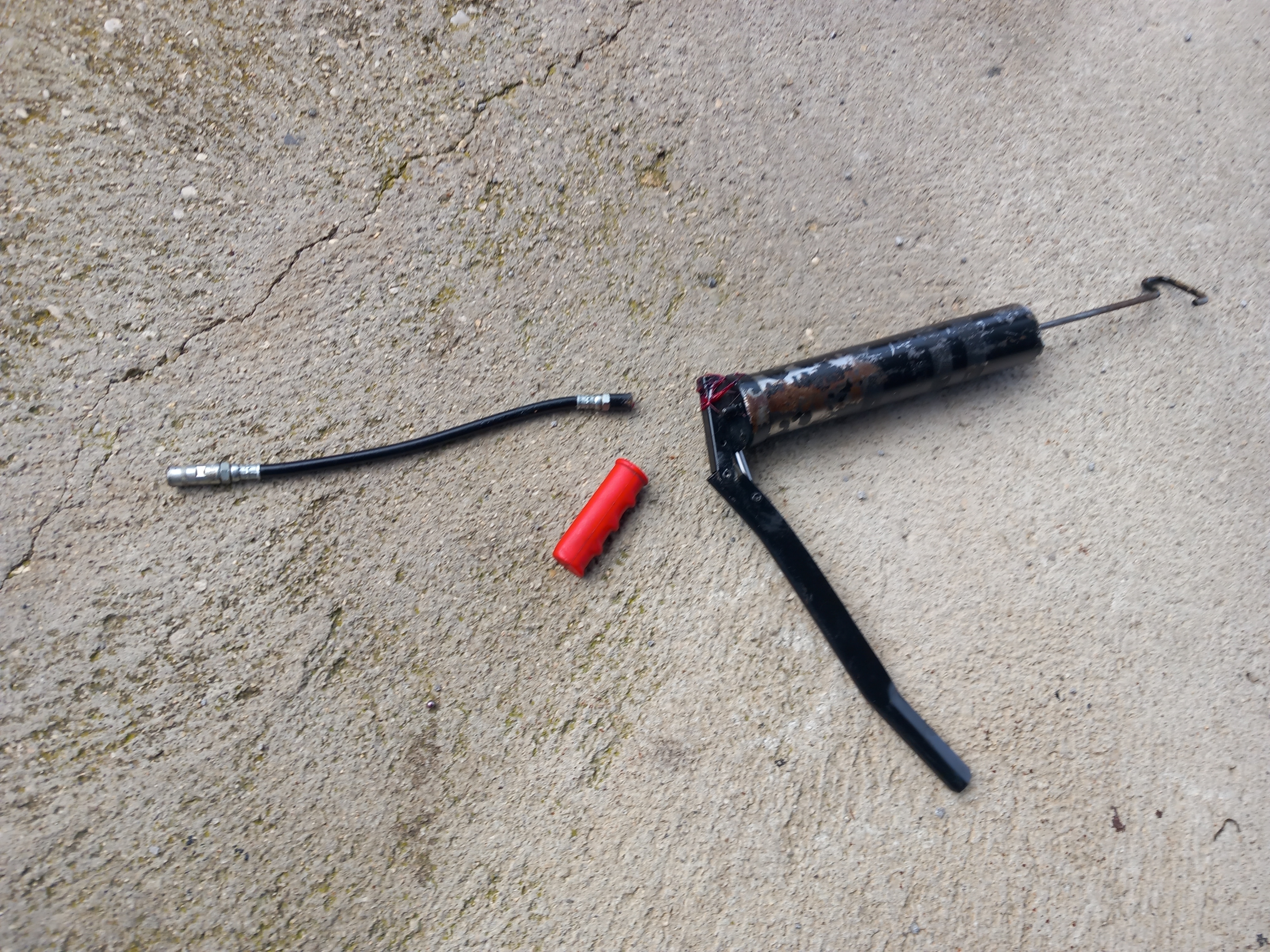 Alors que je regardais les instructions indiquant où se trouvaient tous les points de lubrification du train de roulement, la poignée du pistolet graisseur s'est détachée, qui est tombée au sol et s'est cassée.