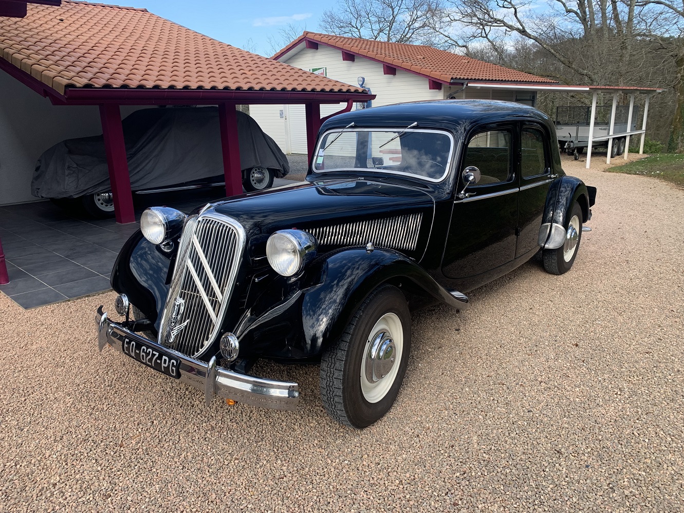 Pour répondre, la voiture sous bâche est une Novaquatre de 1939. Elle est équipée en garnitures tendres et ça freine fort.