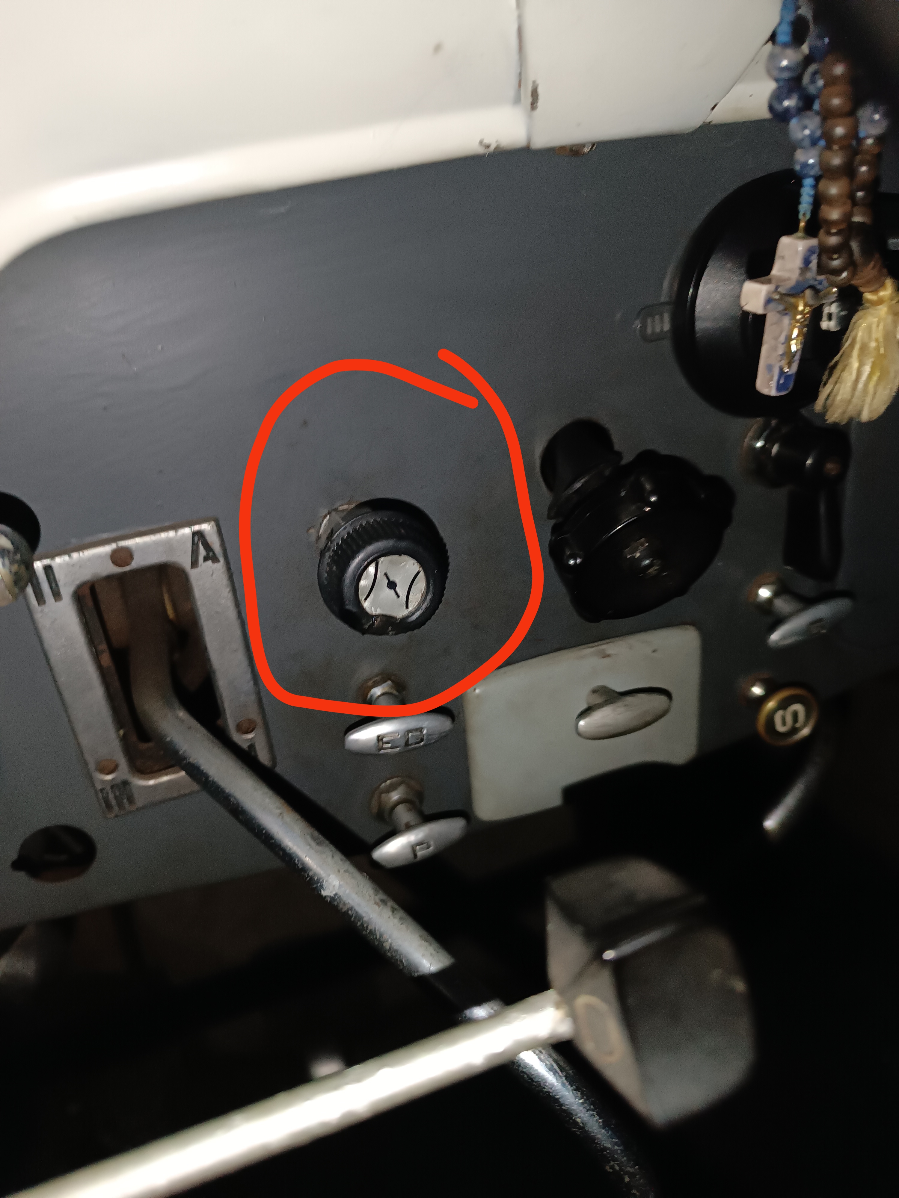 Ton rond rouge est bien l'avance à l"allumage d'origine, probablement qu'elle est défectueuse et elle a été remplacée par une commande d'accélérateur manuelle de tracteur ou de BTP (d’où le sigle d'un volet de carbu sur ton bouton) les commandes d'avance à l'allumage comme les accélérateurs manuels fonctionnent en tirant un câble d'où leur compatibilité et ce remplacement..... les gars qui ont travaillé sur cette auto étaient des bricolos