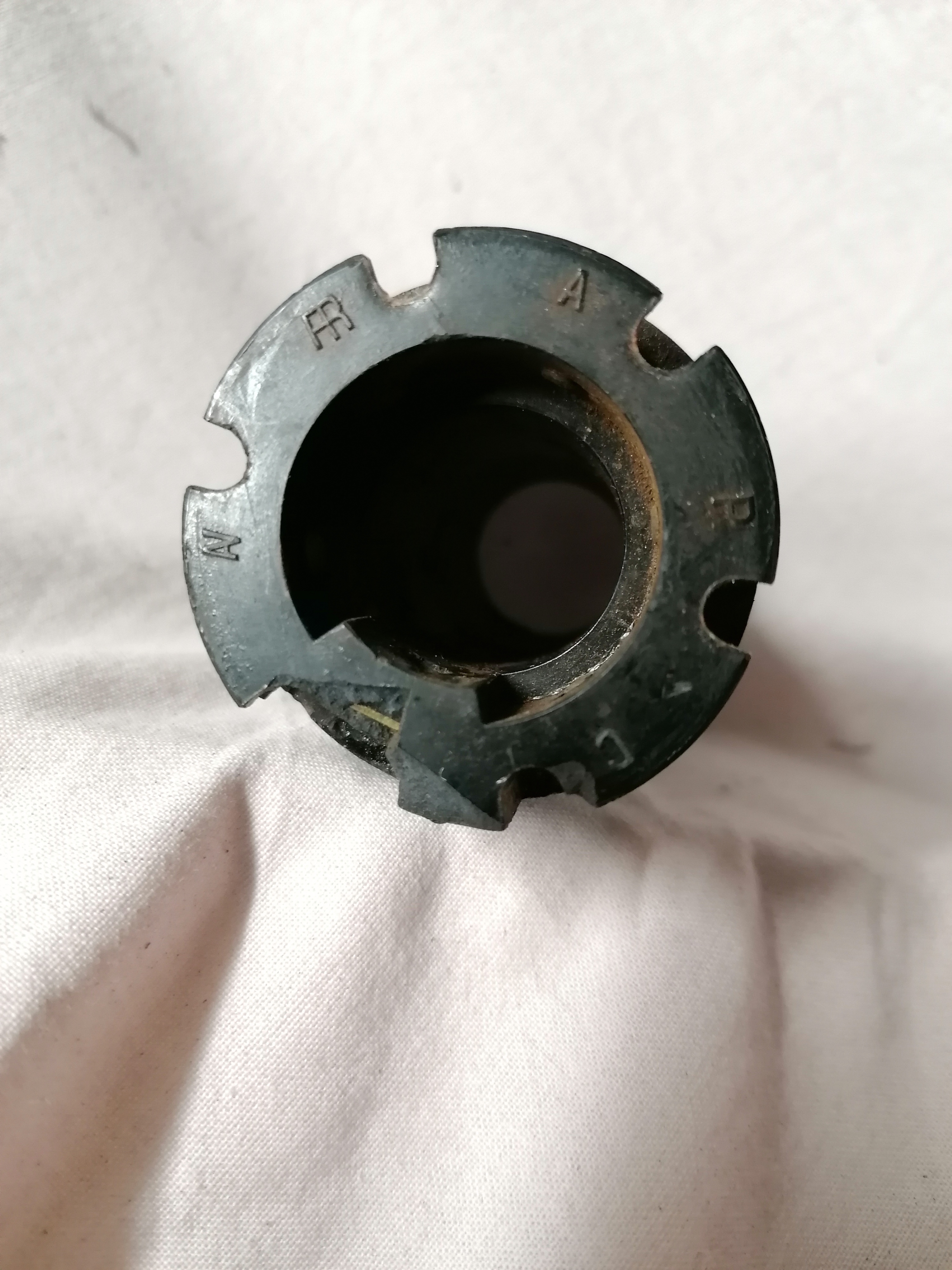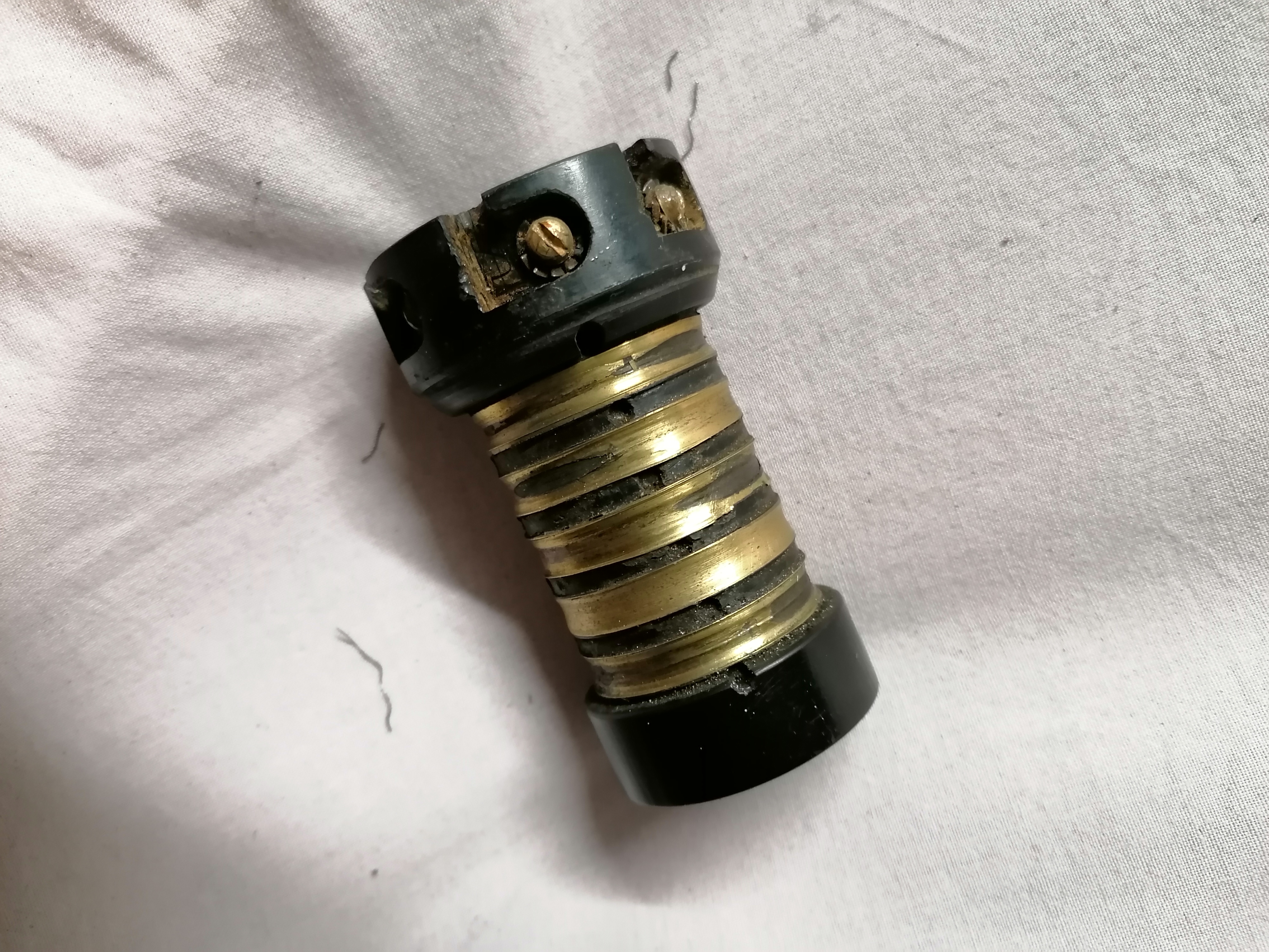 - la pièce à action rotative en photo dont je ne connais pas le nom, avant les 5 bagues en cuivre dans un état correct servant à la connectique vers le sélecteur et la coupelle pour le klaxon.