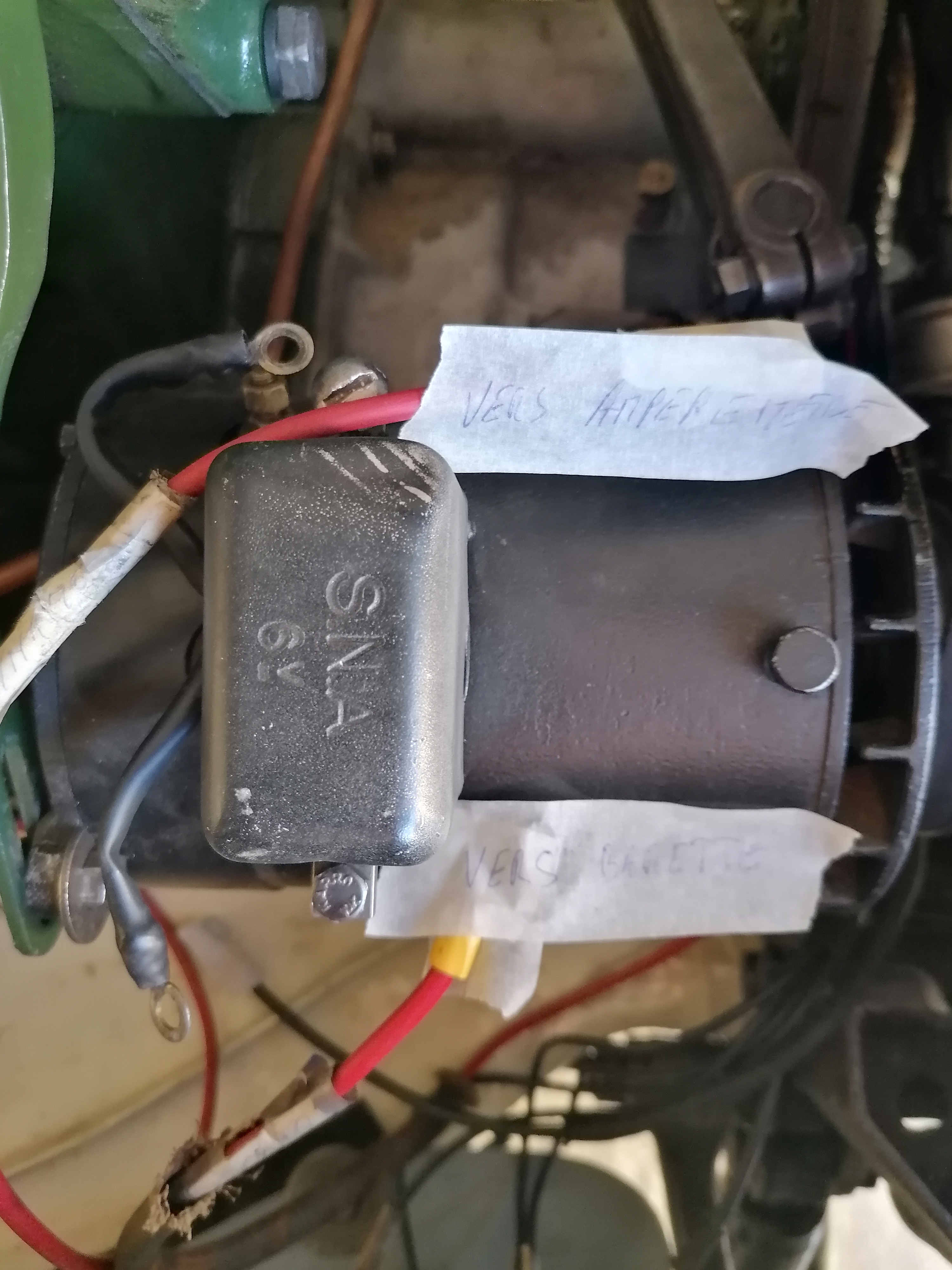J'ai bien alimenté l'ampèremètre via le démarreur et j'ai branché sur sa seconde borne (qui doit servir à redistribuer) le fil rouge qui vient de la borne BAT du régulateur de la dynamo.